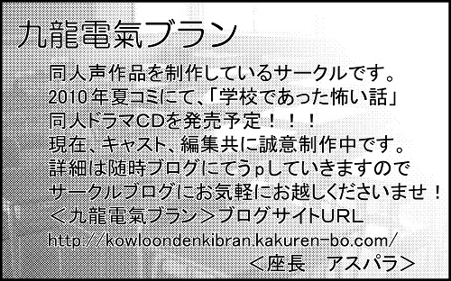 以降、ドラマCDの宣伝、お知らせは、カテゴリーの<九龍電氣ブラン in 学怖 >でお知らせしていきますね☆